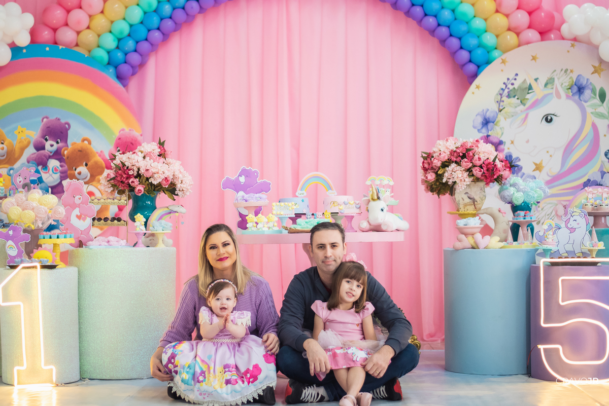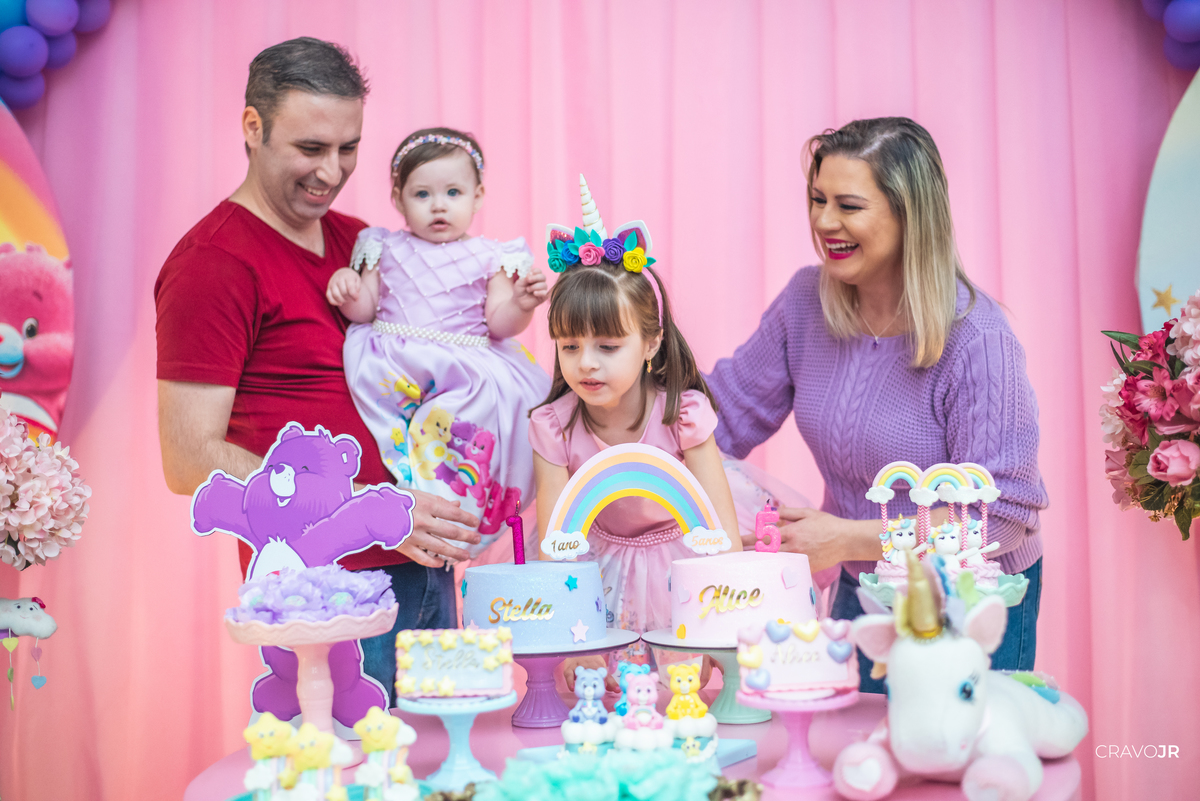 A decoração da festa trouxe dois temas super delicados. O tema de Alice era sobre "Unicórnio", e o tema de Stella era sobre "Os Ursinhos Carinhosos". Os pais das aniversariantes, Rose e Rafael, as acompanhavam e acolhiam os convidados. Foi alegria em dose dupla!