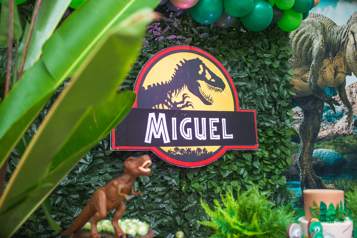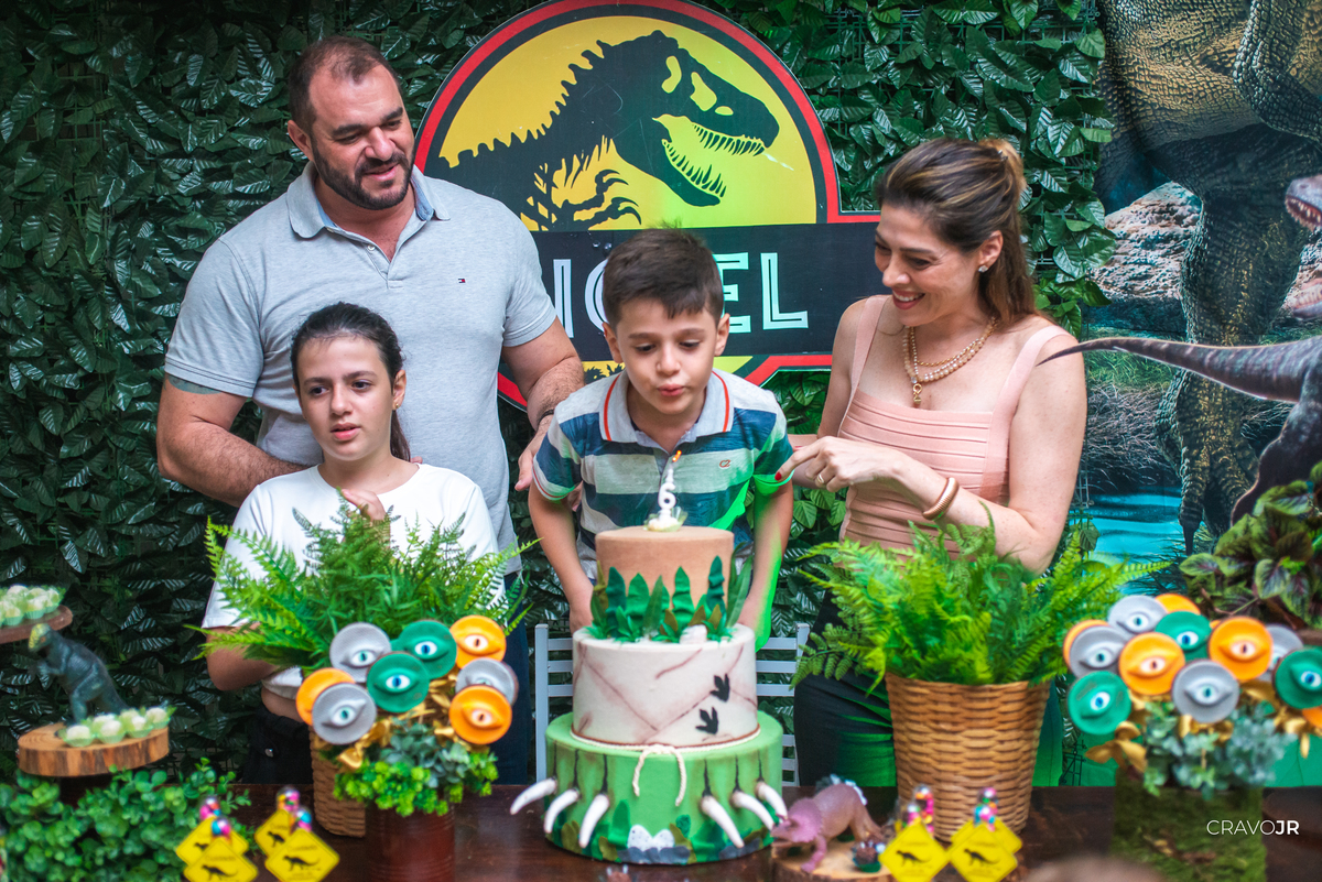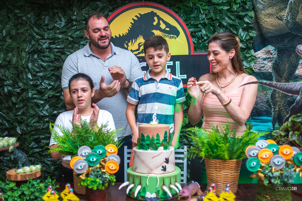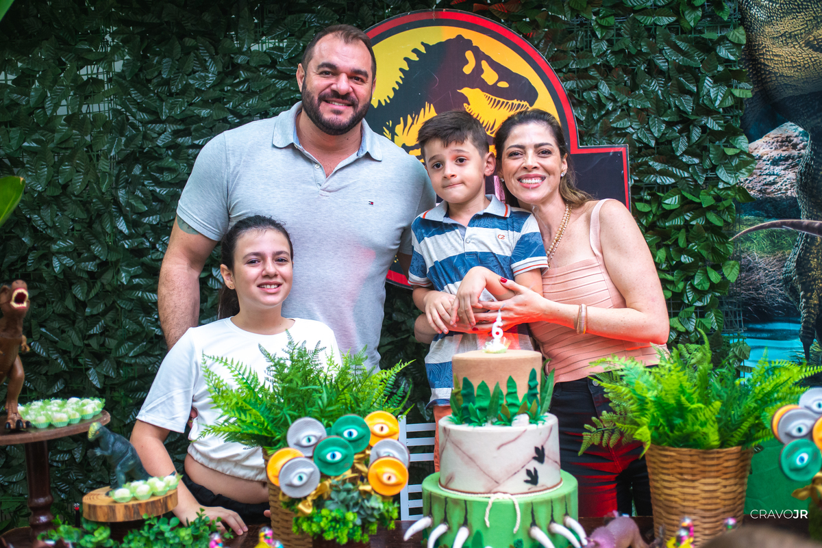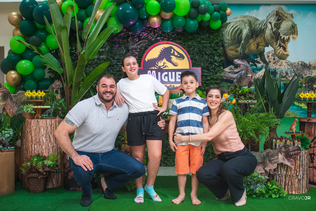 A festa de aniversário do MIguel foi demais! Ao lado dos pais, Carla e Fernando, e da irmã Helena, ele se divertiu pelos brinquedos do Salão de Festas Algodão Doce. O tema da decoração de sua festa era sobre "Jurassic Park".